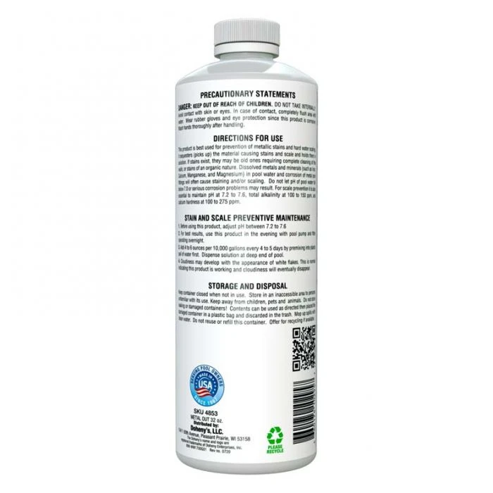 Regular use of this less concentrated metal-out formula is ideal for controlling general stains in home pools and spas and helps to maintain sparkling, clear water. Easily eliminates scum and mineral deposits with regular use.